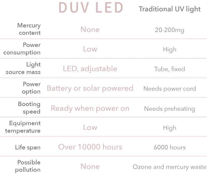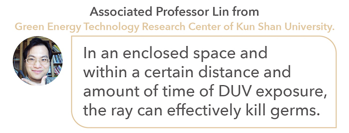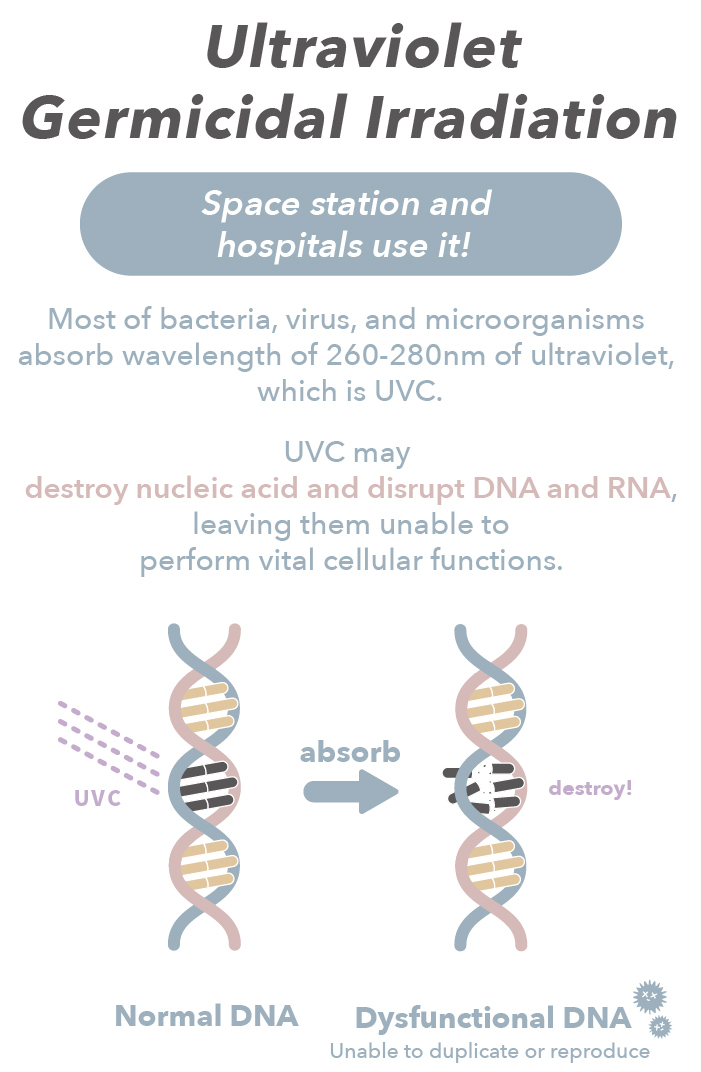 The UVC region occupies wavelengths between 100nm~ 280nm which is not visible to the human eyes. Therefore, we have installed the DUV LED for users to observe while sterilization is in process.