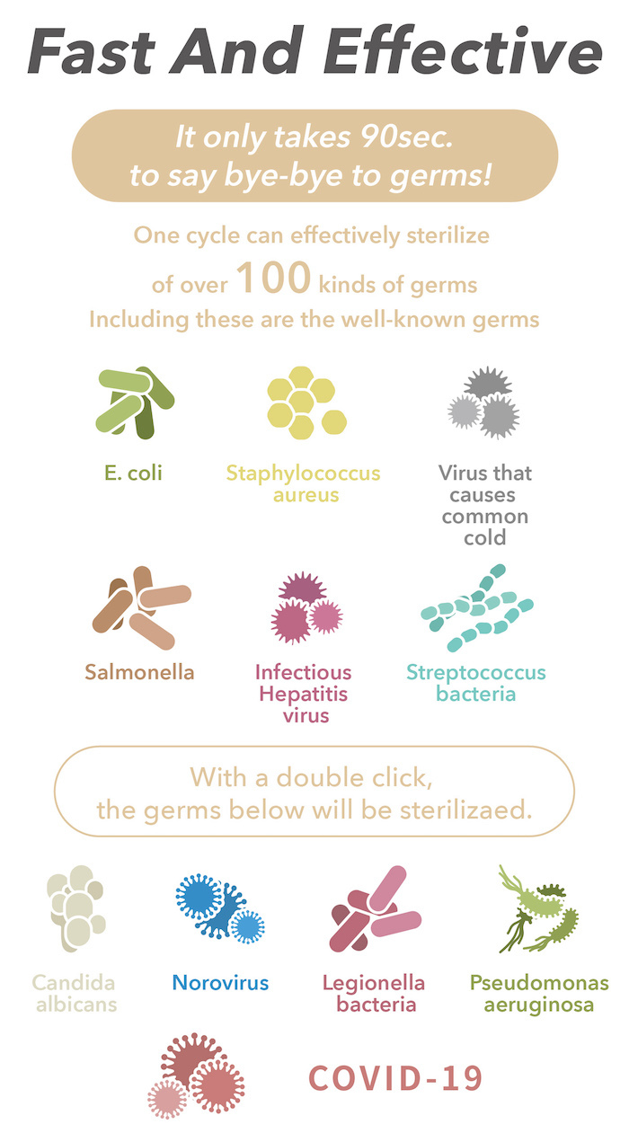 Before feeding the baby, simply put the baby's feeding bottle, pacifier, or tableware in the pouch, press the power button, and wait for 90 sec., sterilization will be done and so are the Enterovirus and Norovirus!