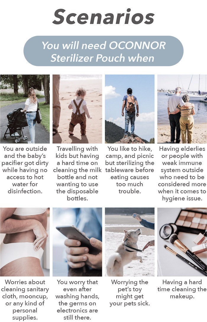 The often-seen steam sterilizers or the UV sterilizers are way too bulky to bring outside. With a OCONNOR Sterilizer Pouch, it is like having another helper around you!