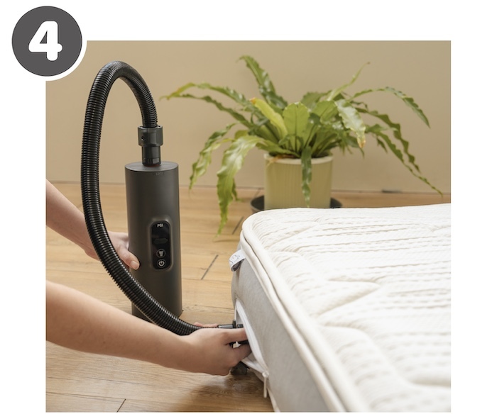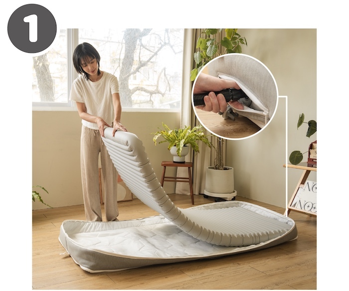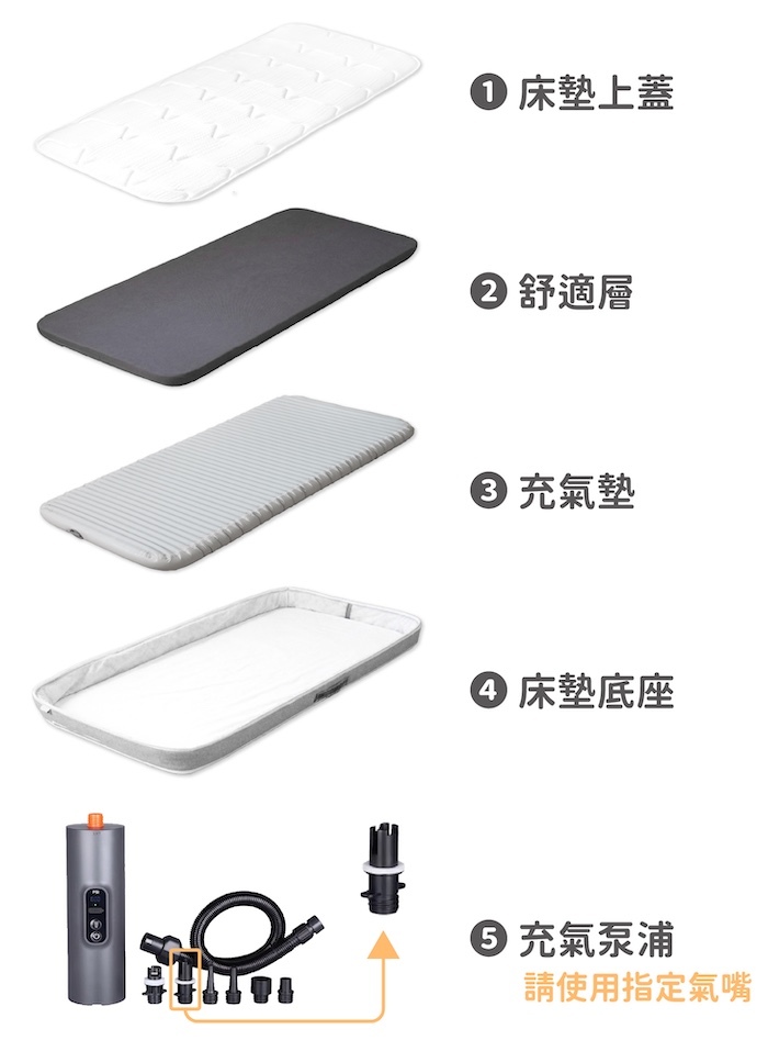 ❸充氣墊先充氣至 1 PSI 後,氣孔對準❹床墊底座側面拉鍊孔放入。