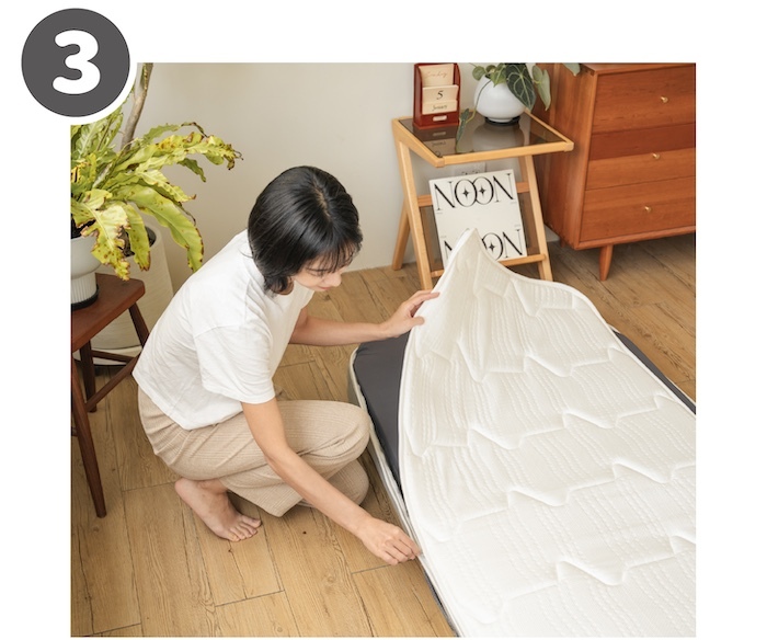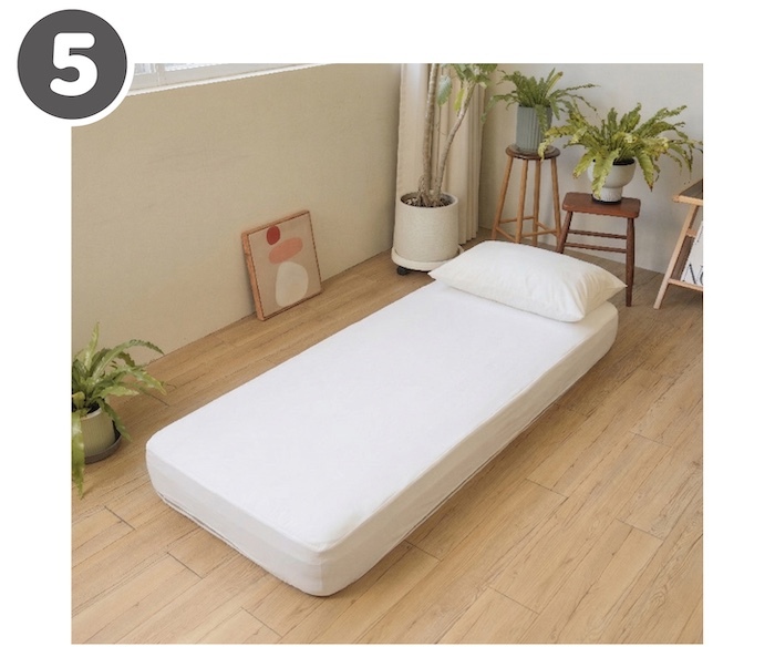 ❶床墊上蓋建議鋪上防水透氣保潔墊,再依季節挑選尼龍(涼感)/純棉(保暖)床包。