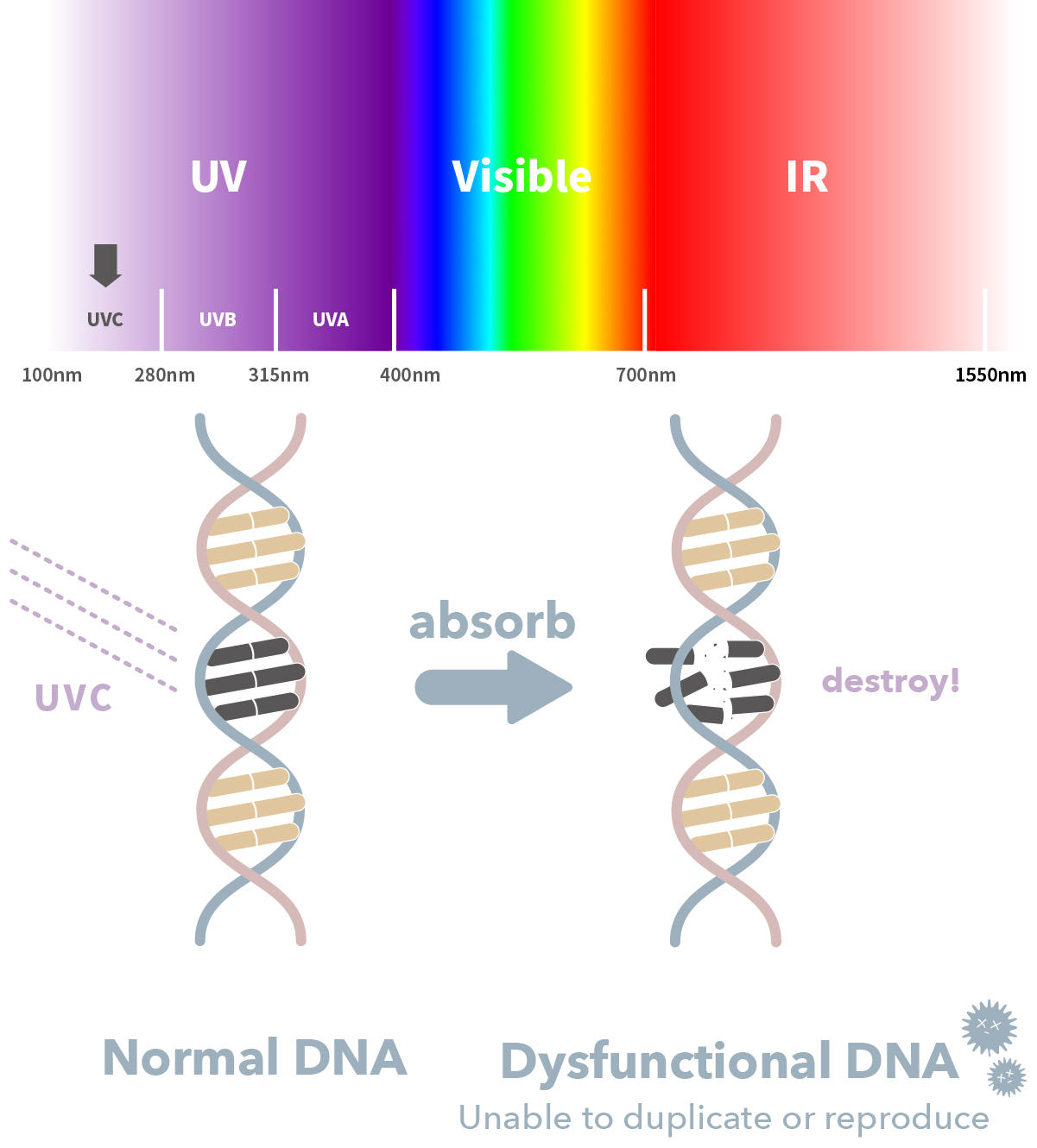 Microorganisms such as bacteria, virus, parasites, germs, and algae etc. are reproduced by budding or sporogenesis. A vast amount of bacteria, viruses, and microorganisms can absorb UV at wavelengths of 280nm - 260nm. By exposing UVC, the germicidal wavelengths can destroy the structure of DNA/RNA and make these organisms unable to form protein; thus, killing the organism or becoming infertile.