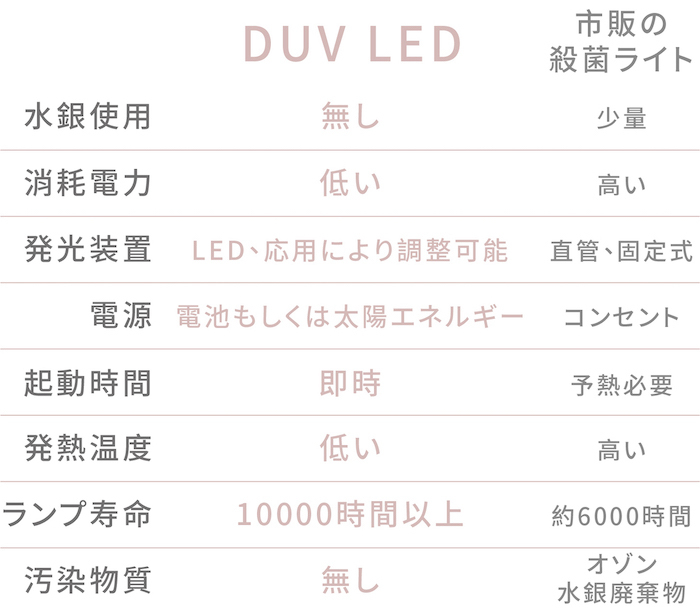 つければすぐに使えて、小体積、省電力かつ予熱不要で安全な深紫外線LEDを使用しています。