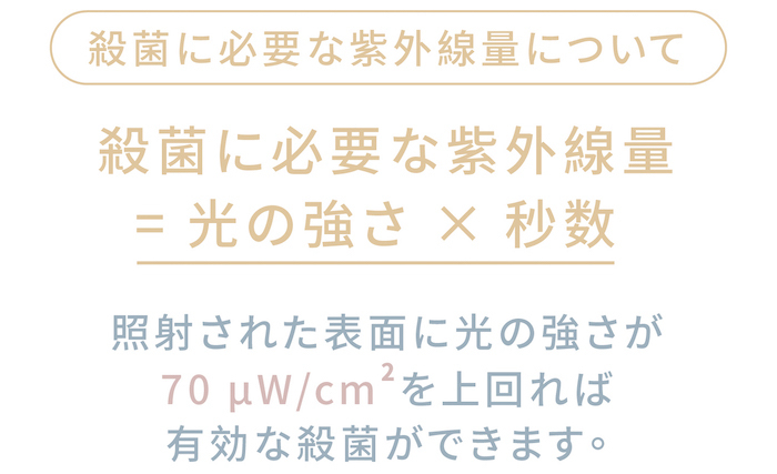 OCONNOR ポータブルUVライト殺菌ポーチ内のUVCの紫外線量は182μW/cm²以上であり、殺菌したい面が照射されていれば確実に殺菌はできます。