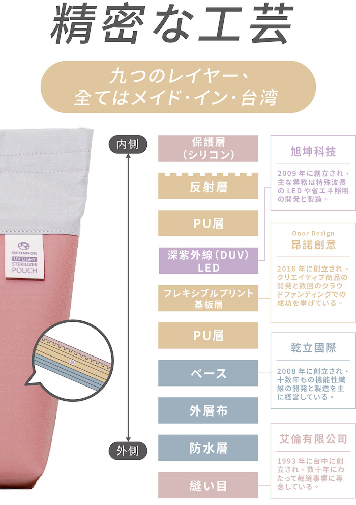 OCONNOR ポータブルUVライト殺菌ポーチが使用する材料は全て厳選されたものだけだなく、台湾で最も進んだUV観測施設を有する崑山科技大学のグリーンエネルギーセンターにSGS認証の前に製品の検査を依頼しました。グリーンエネルギーセンターの協力のもとに、ポーチ内のDUV LEDが有効に殺菌条件に達しているかのテストを何回も実行しました。現時点はいくつかのレポートをいただいていて、SGSとも他の製品の殺菌は有効かどうかを検討している最中です。出荷前にはSGSからのUV殺菌報告を掲載する予定です。