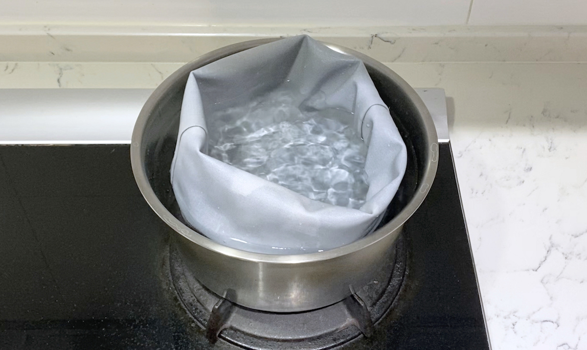 ❶ 將食物袋放入鍋內,矽膠面朝外。(需墊非導熱隔板,例如:木板)