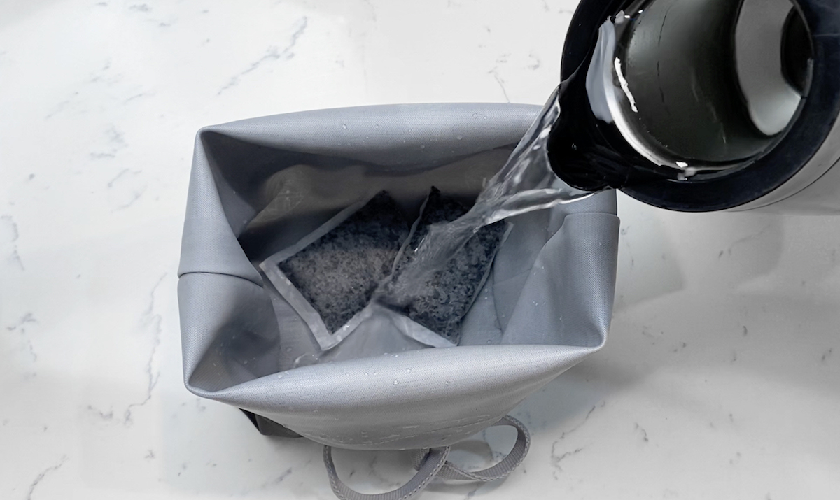 ❶ 食物袋內加入熱水及活性碳包,開口向上放好。