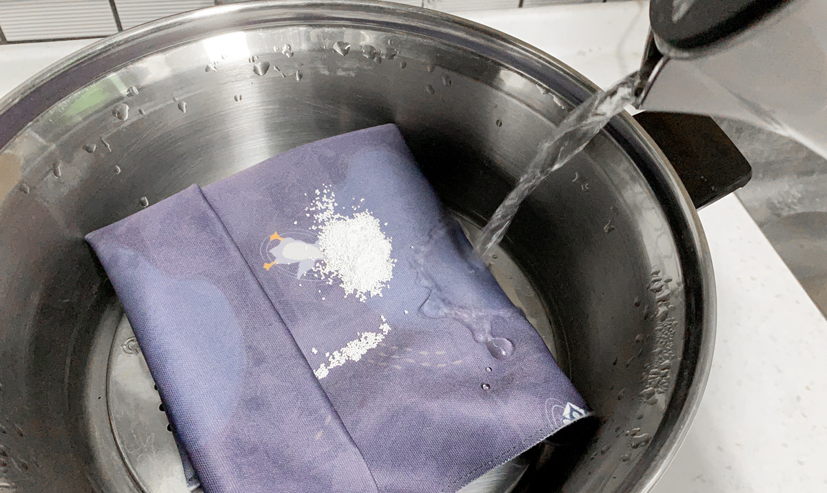 翻轉過來讓矽膠面朝外,同樣朝裡面的布面加入熱水及過碳酸鈉,放置一段時間即可去霉。