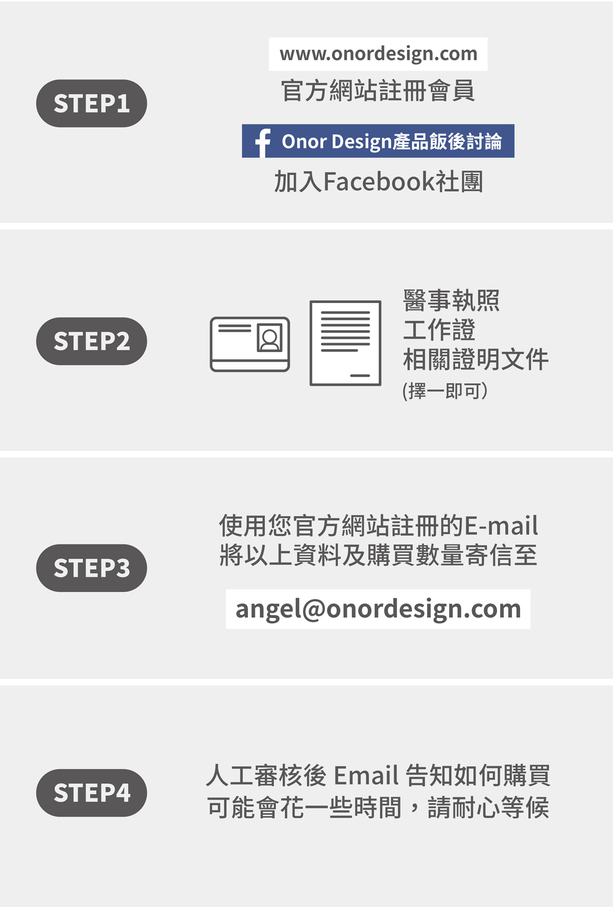 ❸ 請使用您官網註冊時的E-mail帳號,將上述資料寄至angel@onordesign.com