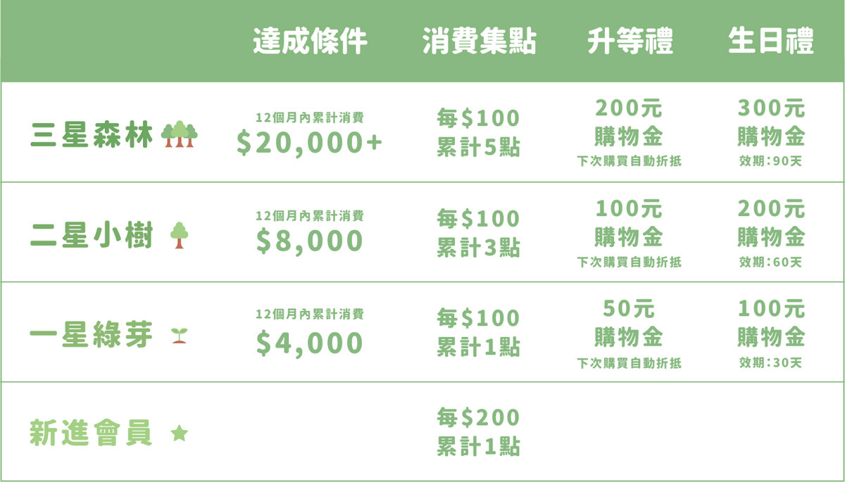 例如:一星綠芽的條件「12個月內累計消費滿$4000」即可續會,假設您的會員期限到2020/10/10,系統會在2020/10/11凌晨去追溯過去2019/10/11 ~ 2020/10/10的消費是否有達到續會門檻,並為您續會或降級。