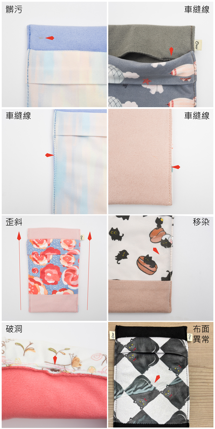 車縫線歪斜、耳朵易斷、內遮偏短、口袋鬆弛等